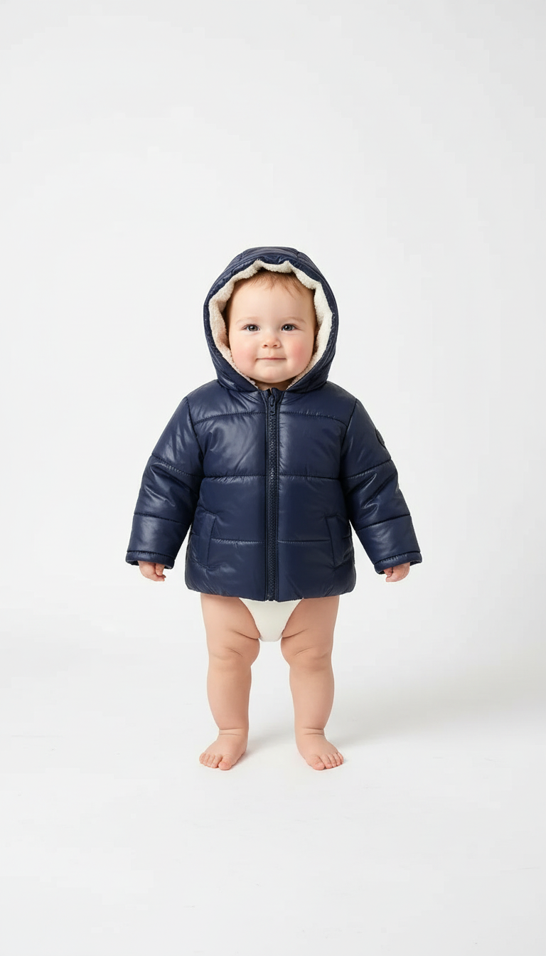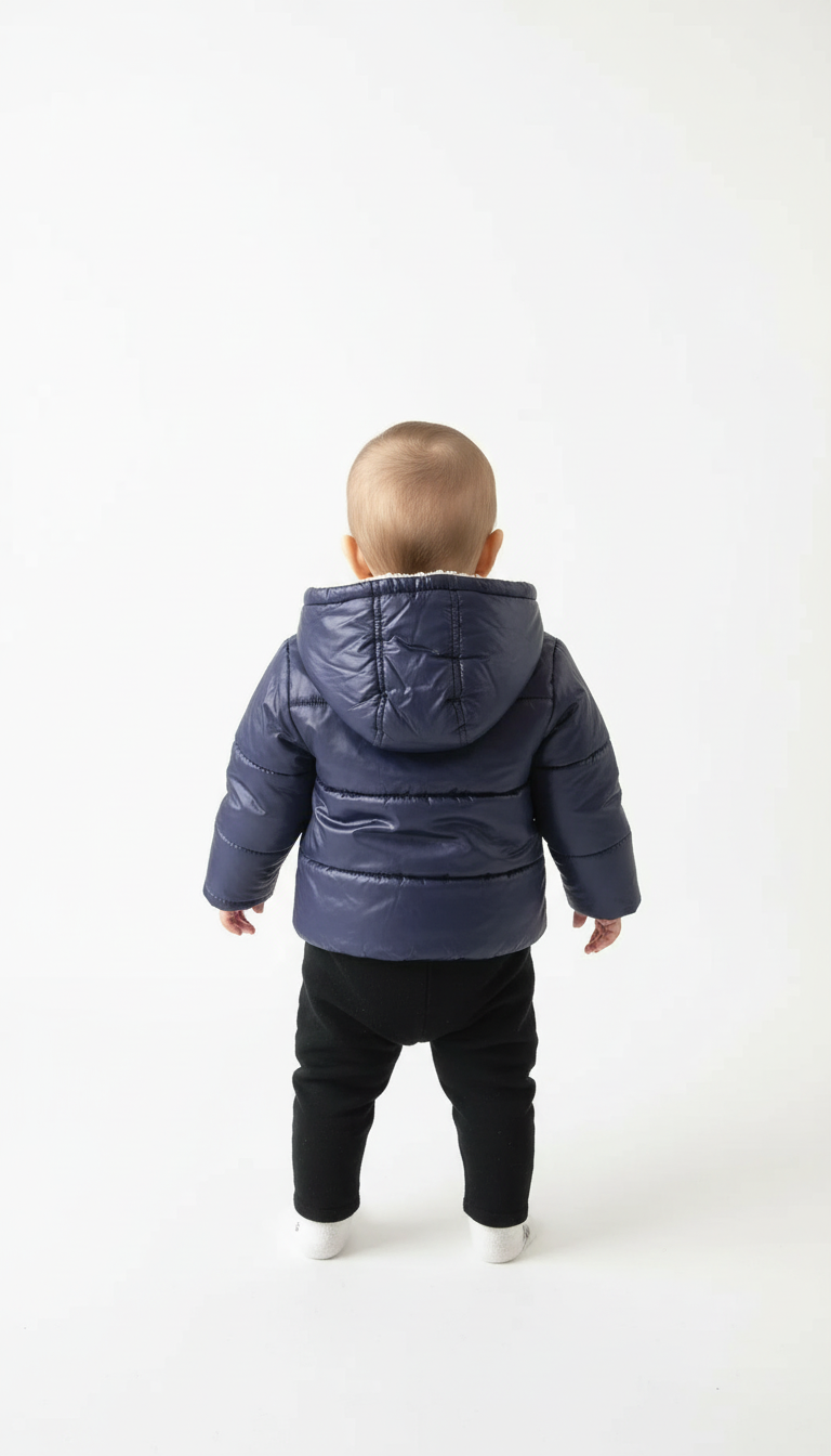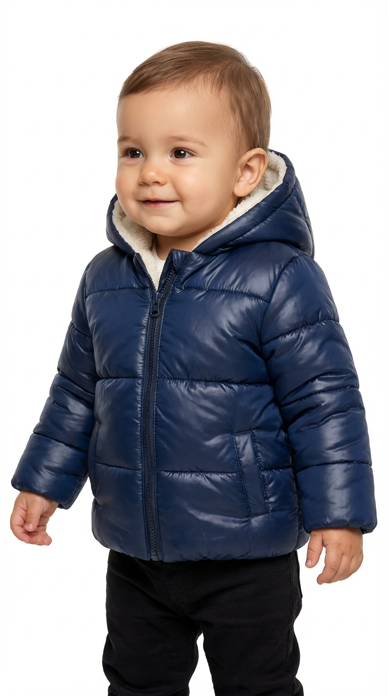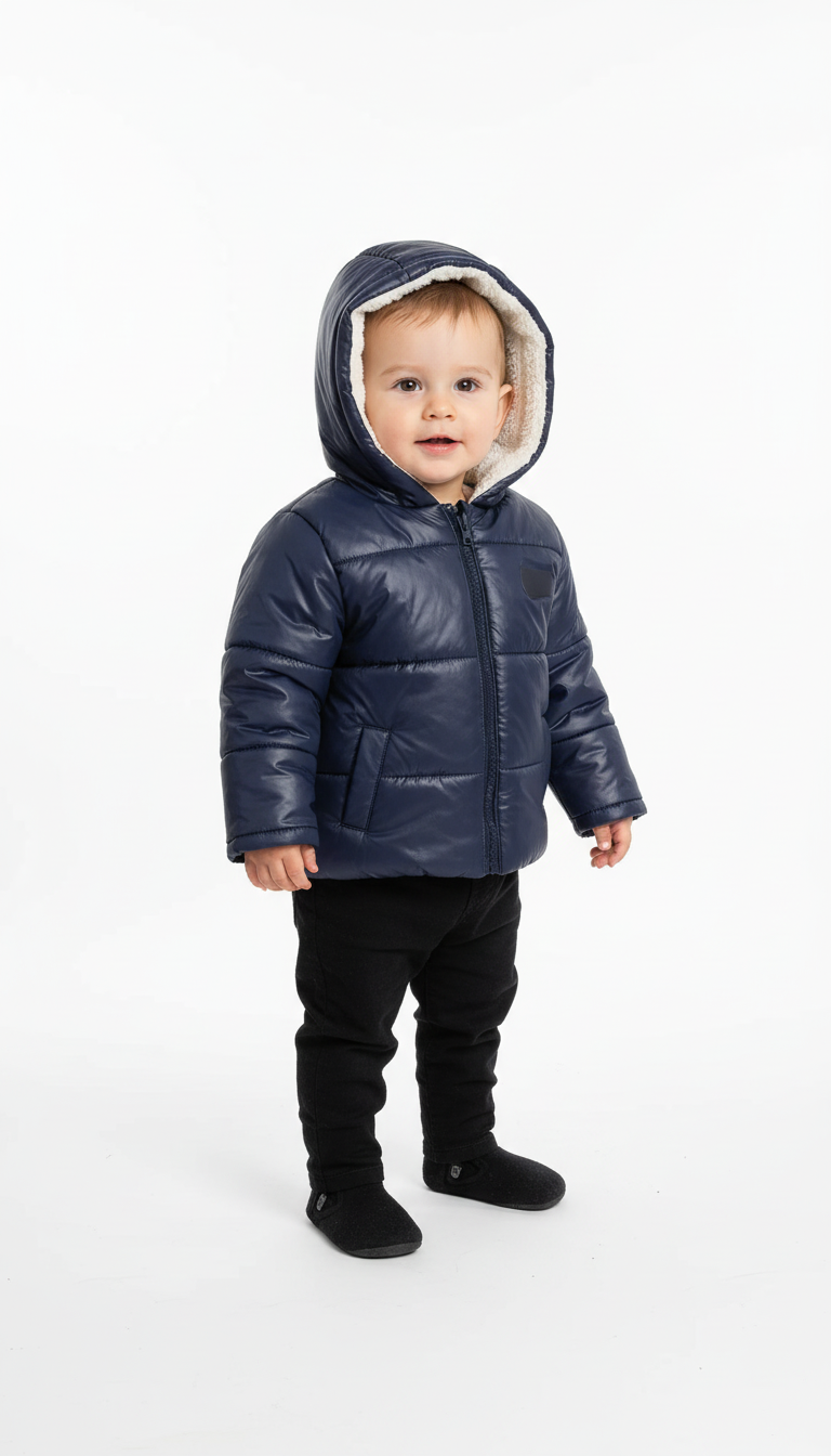 0-2 yaş arası erkek bebekler için özel tasarlanmış kapşonlu kışlık mont.